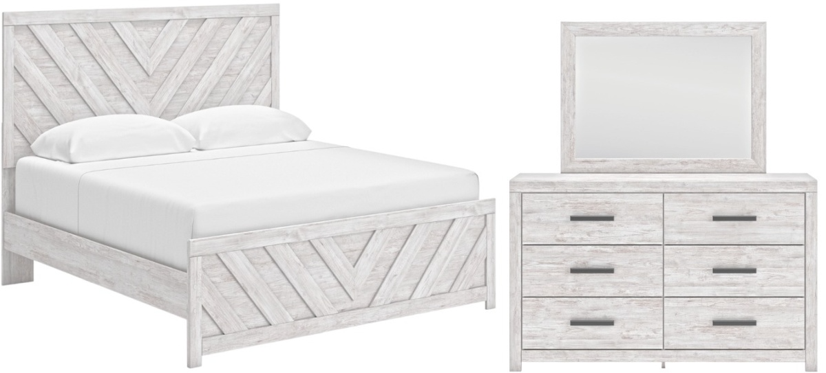 Includes bed (headboard, footboard, and rails), dresser, and mirror