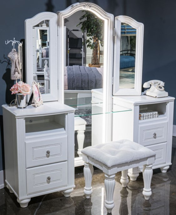 Set includes vanity cabinet and vanity upholstered stool