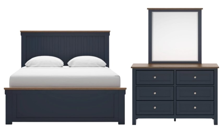 Set includes queen panel bed, dresser and mirror