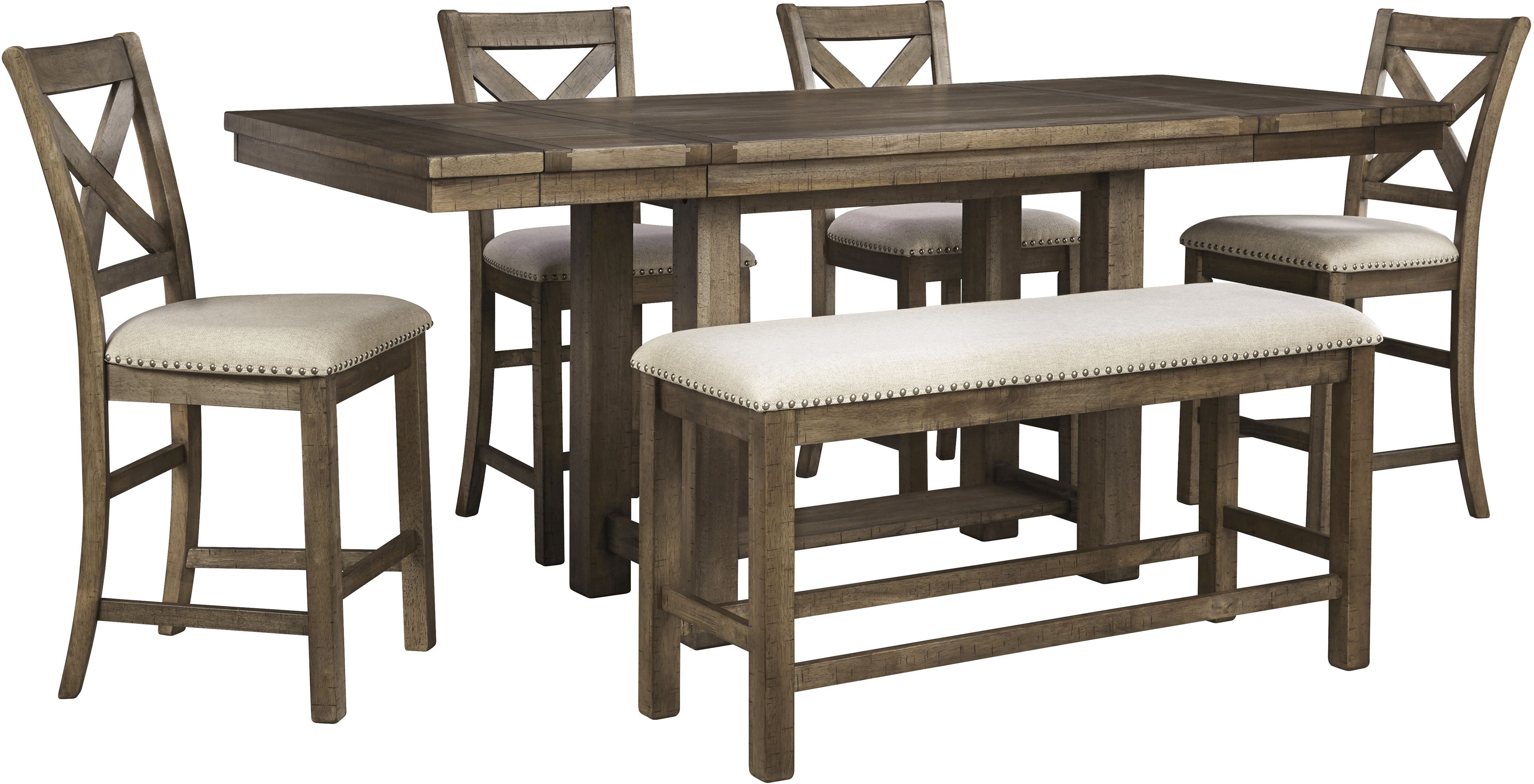 This counter height dining table set with upholstered bar stools and bench elevates the art of casual rustic style. Notable refinements include through-tenon touches, plank-effect tabletop and distressed nutmeg finish that’s warm and welcoming.Read More