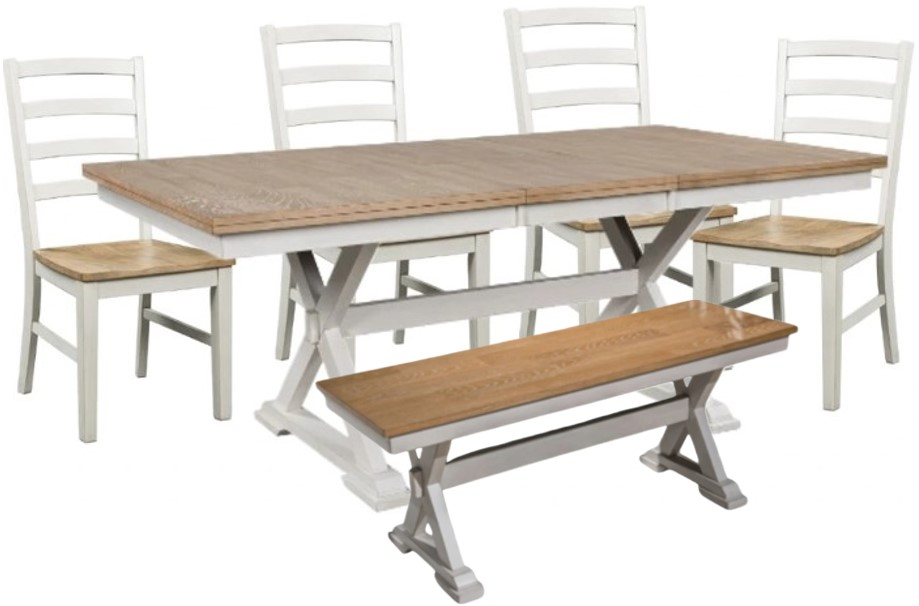 Busy breakfasts and family dinners get a dose of modern farmhouse flair with this dining package. Its two-tone finish contrasts a light butcher block hue with antiqued white for an utterly charming effect. An effortless dining solution, this set adds a touch of chic character to your space.Read More