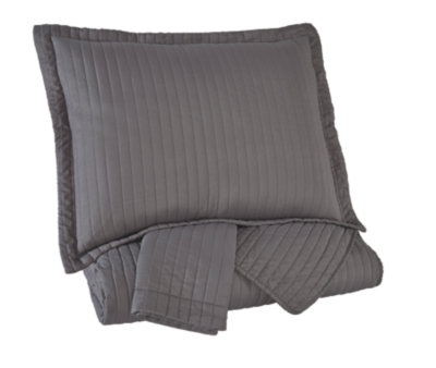 The singular, sensational color of this coverlet set is given just enough oomph care of stylish hand-stitched ribbing. Rest assured, less can be so much more. Comforting to know it's machine washable, too. 2-3-Piece Coverlet Set - Includes Coverlet and 2 Shams (1 in Twin). Channel Stitched Design in Gray. Polyester Cover with Polyester/Cotton Blend Filling. Machine Washable. For more than 70 years, we’ve set out to prove furniture can be made a better way. We design and craft timeless styles that are comfortable and livable. For our guests, living the American dream is as affordable as it is priceless. Our exclusive furniture and accessories start with a sketch inspired by the design team's travels around the world. Many Ashley products are assembled in the U.S. with domestic and imported parts, and quality tested so they arrive in your home, ready to enjoy for years. We recognize one style does not suit all. That’s why you’ll find so much to love in our wide selection of room-to-room furnishings. From industrial electric to rustic farmhouse, discover on-trend styles made for mixing and standing out. *Coverlet set only, other items shown sold separately.