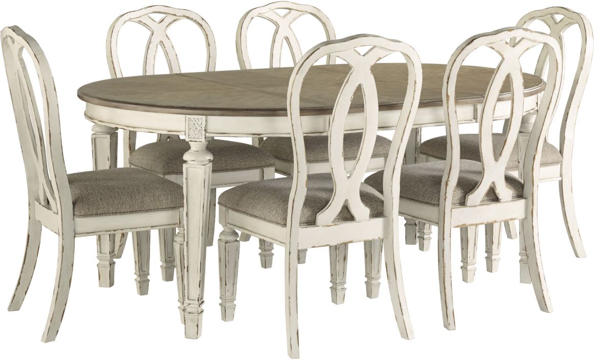 Bon appétite. The Realyn dining room extension table has all the right ingredients for a French country-inspired feast for the eyes. Drop-in leaf allows you to transform an intimate round dining table into a gracious oval dining table that comfortably seats six. Antiqued two-tone aesthetic pairs a chipped white with a distressed wood finished top for a double serving of charm.Read More
