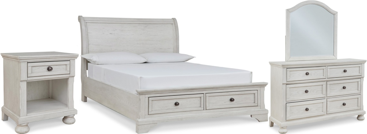Set includes: full sleigh storage bed (headboard, storage footboard, rails, and roll slats), dresser, mirror, and nightstand