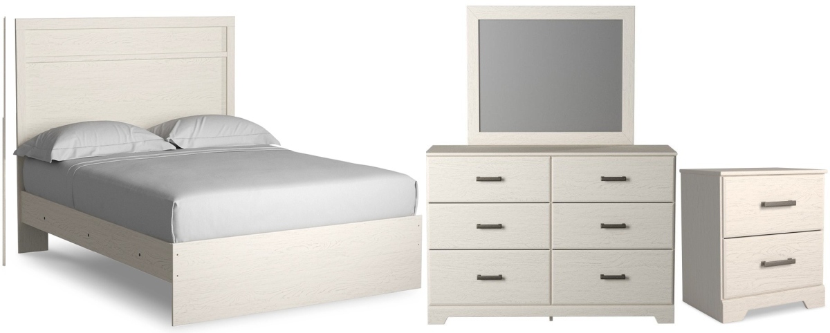 With its clean-lined look and modern attitude, this full panel bed is a fresh style awakening. A crisp, white hue over subtle replicated wood grain easily complements other furniture finishes. The simple, unadorned profile is given depth and dimension with the addition of plank-style moulding on the headboard proof that beauty lies in the details.