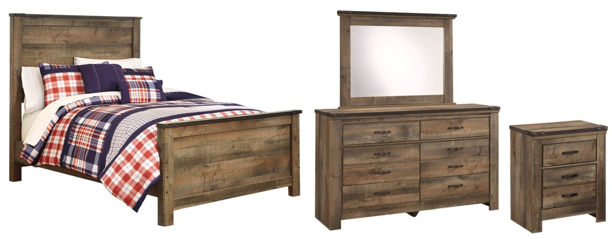 Includes full bed (headboard, footboard and rails), dresser, mirror, and nightstand