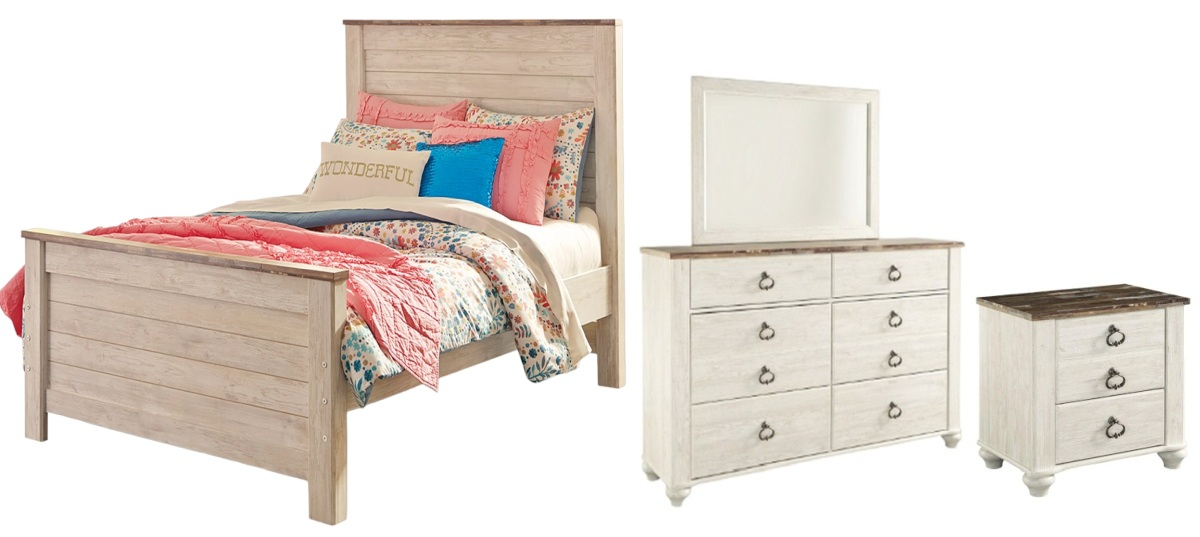 Includes bed (headboard, footboard and rails), dresser, mirror, and nightstand