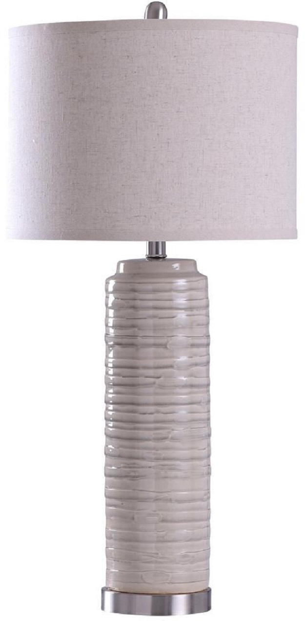 Use StyleCraft Anastasia Table Lamp to illuminate your transitional living room. The table lamp features a ceramic body with white and silver stripes and a sleek base of silver steel. An oval steel finish extends above the white drum shade of styrene.