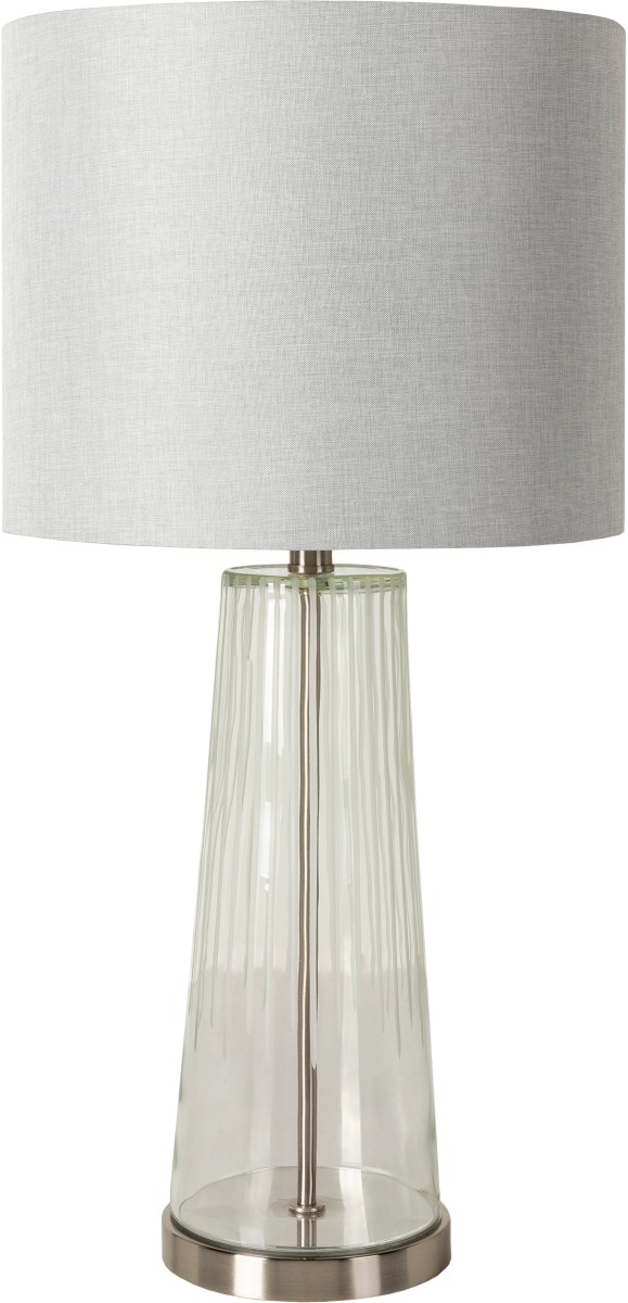 The Blawnox Lamp features clear translucent glass body, gray linen shade, and a brushed steel base.Read More