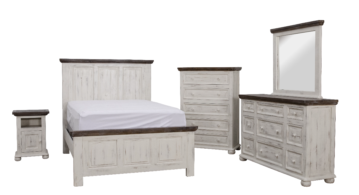 This Allie full 4 piece bedroom set by Vintage Furniture features a full panel bed, dresser, mirror, and the one door nightstand. This collection has a Nero White rustic finish with an Ashe finish on the top. Vintage Furniture is handmade of solid wood construction and all hand-finished to create a unique quality look made to the highest standards of craftsmanship.
