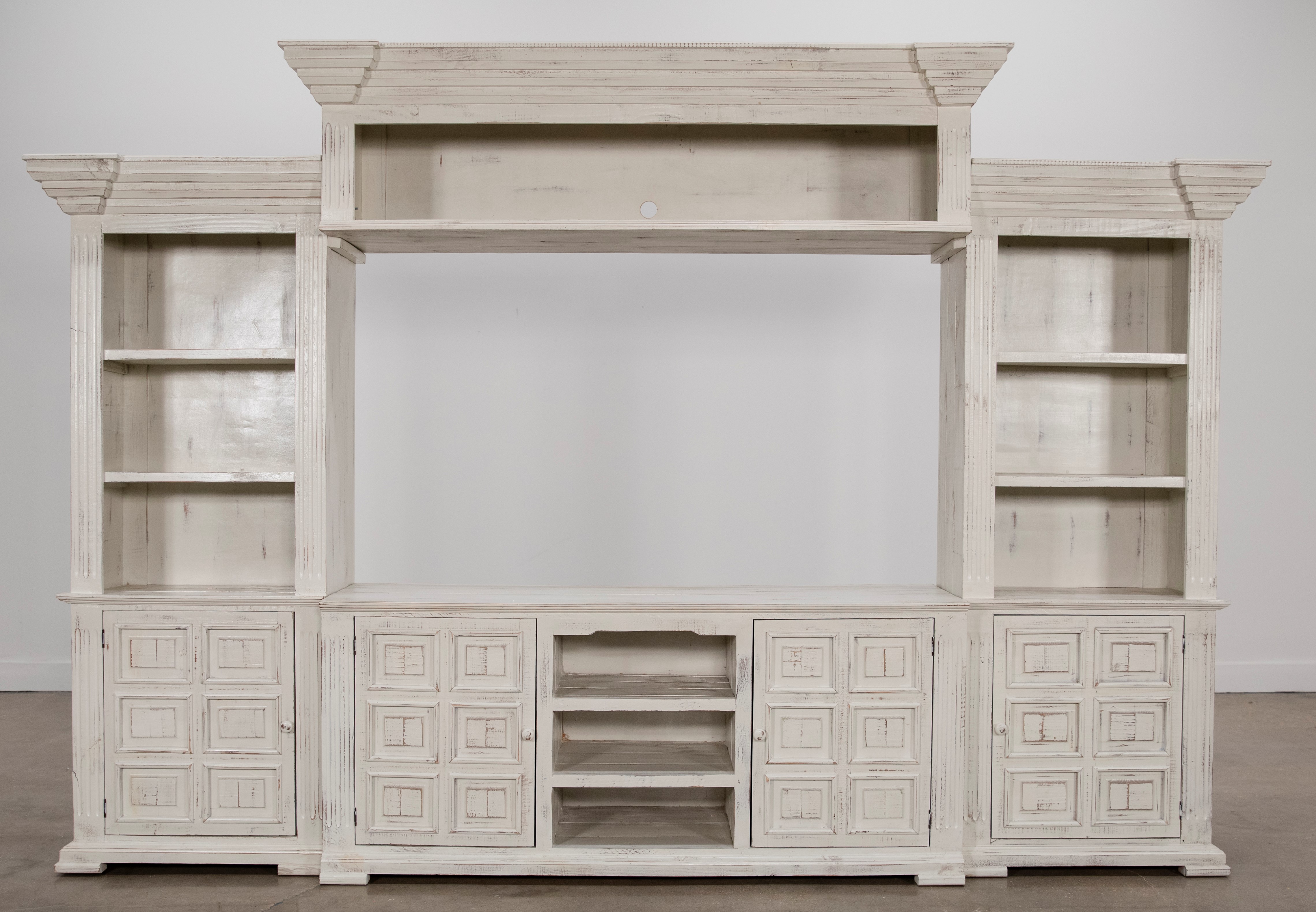 Nero White Chalet 4 Piece Entertainment Wall Unit by Vintage Furniture. Vintage Furniture is handmade of solid wood construction and all hand-finished to create a unique quality look made to the highest standards of craftsmanship.