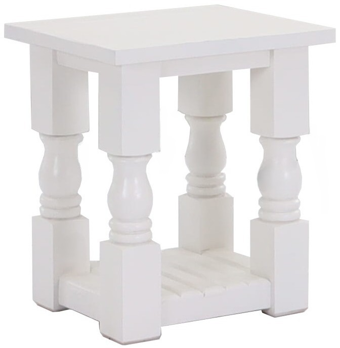 This chairside end table by Vintage Furniture in the Solid White finish features detail on the legs and has a shelf on the bottom.Read More