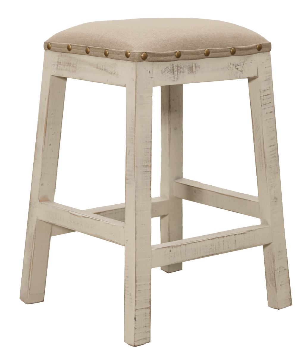 This Vintage Furniture bar stool is part of the Hudson and Westgate dining collections. It features Nero White legs with a beige cushioned seat. The seat also has painted nail detail around the edge.