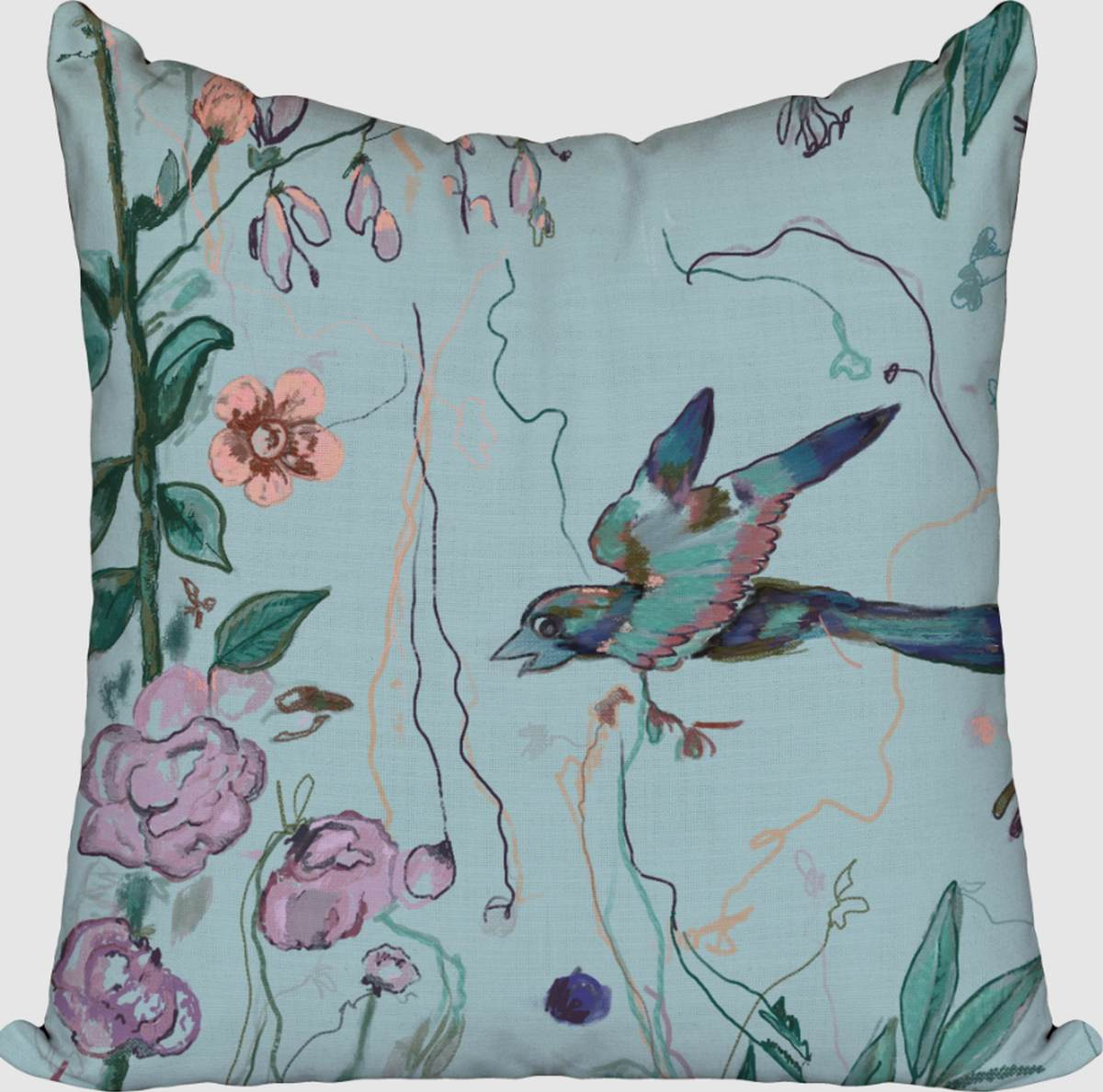 Birds of a Feather Aqua pattern custom designed by Windy O'Connor. Dressmaker details, luxury backing fabrics, and hidden zippers make a beautiful quality luxe pillow.Read More