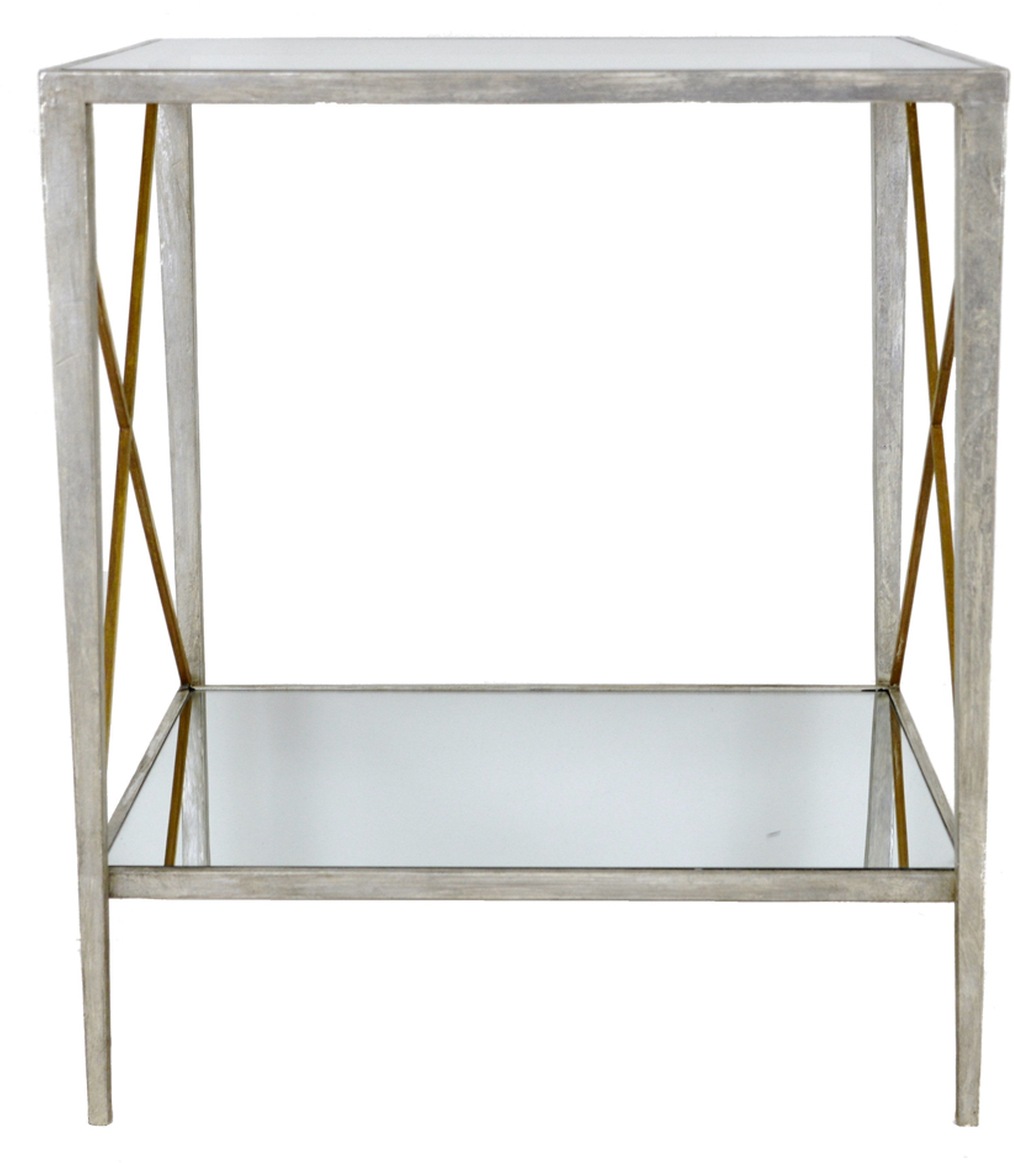 Handmade Antiqued silver leaf side table with metal frame. With tempered glass top and antiqued mirrored bottom.Read More
